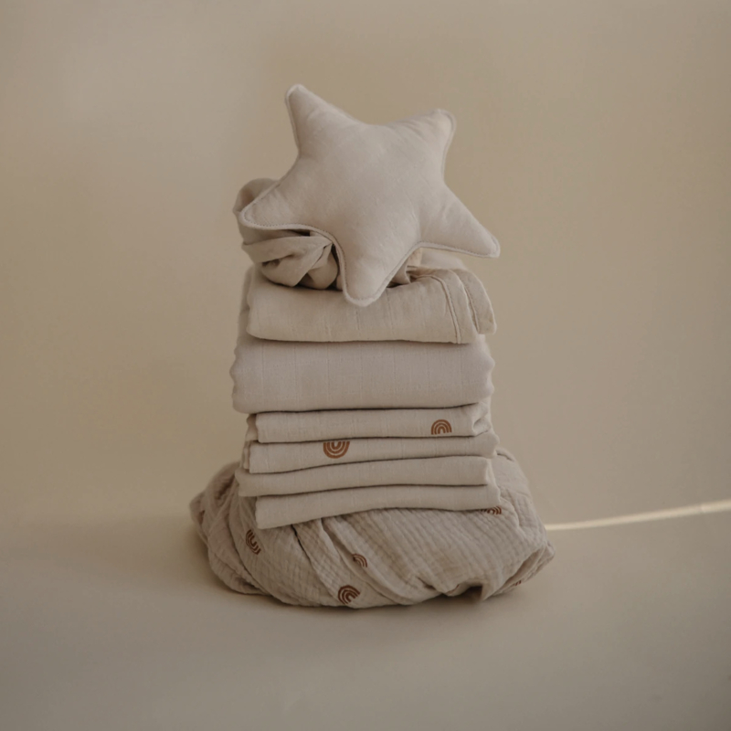 Wash at max 30ºC (80ºF). Lay muslin cloth flat to dry; do NOT tumble dry, bleach, iron or dry clean.